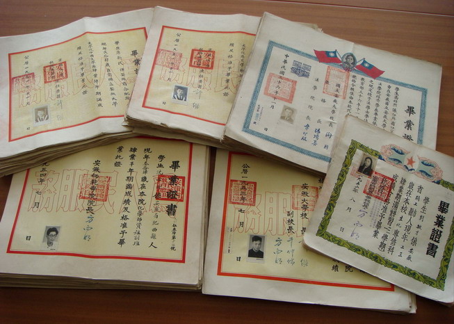 特别是其中22件1947年盖有“国立安徽大学关防”代发省立安徽大学的毕业证书,正上方由梅花衬托着孙中山头像,贴有印花税票,十分难得。另有一些证书的背面记载着学生各学年的成绩,十分详细。它们的征集入馆,进一步丰富了我校档案馆的馆藏种类。这是研究民国时期、解放初期我校办学历史十分珍贵而重要的档案,具有永久的保存和利用价值。档案馆将妥善保管上述珍品,并将选择适当实物在校史馆展览陈列。